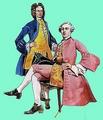 Оба кавалера одеты сходным образом. Расклешенные полы облегающего спину и грудь камзола как раз покрывают колено. На спине и по бокам, как и прежде, имеются разрезы. Воротника нет, вырез ворота относительно глубокий. Спереди камзол можно застегнуть сверху до талии на пуговицы и петли. Узкие рукава кончаются огромными отворотами значительно выше запястий. Сидящий на стуле кавалер носит манжеты-"краги"; стоящий рядом кавалер носит круглые манжеты. Покрой жилета во многом повторяет покрой камзола. Жилет облегает фигуру до талии, а его полы посажены на клееный холст. Пуговицы и петли идут от ворота до подола. Жилет застегивали у ворота - на одну-две пуговицы, и у талии, чтобы показать жабо на шее. От талии вниз жилет оставляли незастегнутым. Штанины собранных на поясе панталон сужались книзу и оканчивались находящим на чулок манжетом. Башмаки с квадратными носами имели высокие квадратные каблуки. Верх башмака переходил в прямоугольный язычок, доходивший до уровня щиколотки. С боков башмаки были закрыты, застегивались они с помощью ремешка и пряжки поверх язычка.