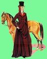 В дамских костюмах для верховой езды еще сохранялось много элементов стиля времен Директории, как-то:низко вырезанный спереди воротник capuchin. Короткий жилет имел лацканы, которые накладывались на лацканы жакета с укороченной талией. Юбка была длинной и объемной, так что при ходьбе даме приходилось перекидывать ее через руку. На даме на рисунке батистовая блуза с оборками на груди и мужской шейный платок, завязанный спереди узлом. На голове у нее мужской цилиндр, сменивший жокейскую шапчонку времен Директории. Волосы дамы уложены классическими локонами, на руки надеты тонкие короткие кожаные перчатки.