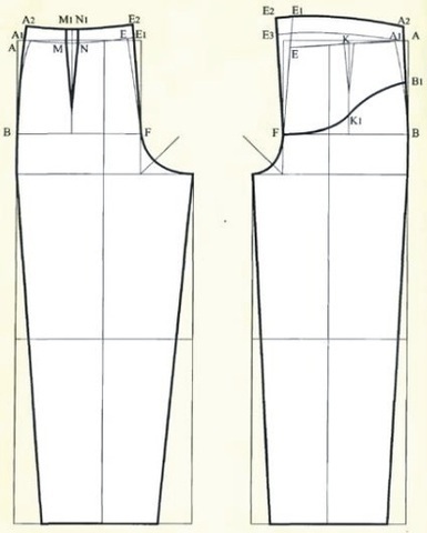 Проведем контур верхней части брюк по точкам В А1 А2 М1 N1 Е2 Е1 F.